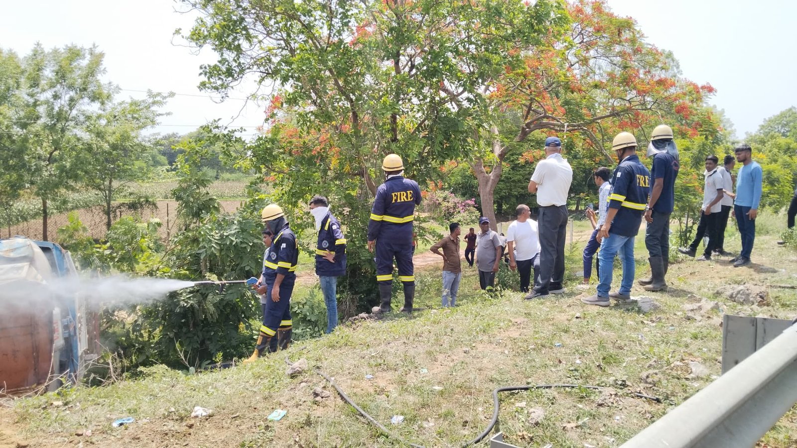 જે ટીમ ને માલૂમ પડેલ કેમિકલ નો 20000 લિટર નો સ્ટોક H2O2 (Hydrogen peroxide) હોય તો પાણી ની વધારે જરૂરિયાત હોય તાત્કાલિક ધોરણે આણંદ થી બીજી 2 ફાયર ની ગાડી રવાના કરેલ તથા નડીયાદ થી પણ એક ગાડી મંગાવેલ એમ ટોટલ – 3 મોટા ફાયર ફાઈટર અને 1 નાનું મિની ફાયર ટેન્ડર ઘટના સ્થળ પર રવાના કરેલ તથા નડિયાદ ના (DFo) સાહેબ શ્રી દીક્ષિત ભાઈ પટેલ) ને આણંદ ના ( sto– ધર્મેશ ગોર સાહેબ તાત્કાલિક ધોરણે ઘટના સ્થળે પહોંચી માર્ગદર્શન પૂરું પાડેલ જે કંપની ની વિગત લેતા તે ટેન્કર ઇન્ડિયન peroxide કંપની દહેજ નું હોય તે દહેજ થી અહમદાબાદ તરફ જતું હોય ત્યાં એક્સપ્રેસ હાઇવે પર આણંદ ની હદ માં દૂર ઘટના સર્જાયેલ છે જે ગાડી નંબર (GJ 06 AT 6256) તથા ડ્રાઇવર નું નામ બલજીદર સીંગ માલૂમ પડેલ છે જેમાં કોઈ પણ પ્રકાર ની જાન હાની થયેલ નથી