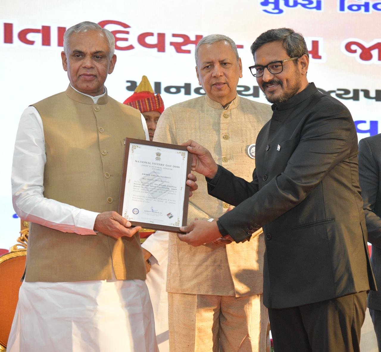 आणंद | राष्ट्रीय मतदाता दिवस के अवसर पर गांधीनगर में आयोजित राज्यस्तरीय समारोह में आणंद जिले को बड़ी उपलब्धि मिली है। प्रभावी चुनाव प्रबंधन एवं नवाचारी मतदाता जागरूकता गतिविधियों के लिए आणंद जिला निर्वाचन अधिकारी एवं जिला कलेक्टर प्रवीण चौधरी को ‘बेस्ट इलेक्टोरल प्रैक्टिसेज – 2025’ श्रेणी में राज्य स्तरीय पुरस्कार से सम्मानित किया गया।