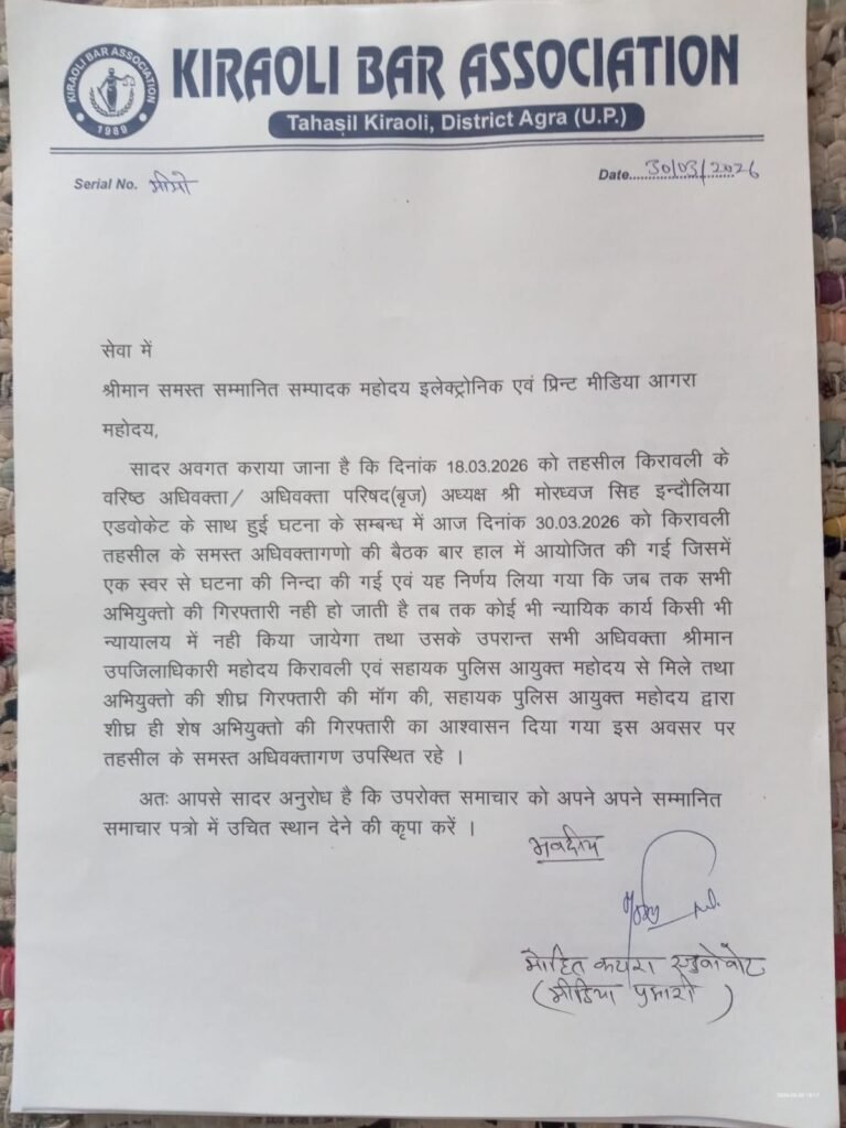 किरावली बार एसोसिएशन के बार हॉल में आयोजित इस बैठक में गत 18 मार्च 2026 को वरिष्ठ अधिवक्ता एवं अधिवक्ता परिषद (ब्रज) के अध्यक्ष श्री मोरध्वज सिंह इन्दौलिया के साथ हुई घटना पर चर्चा की गई। अधिवक्ताओं ने एक स्वर में इस घटना की घोर निंदा की और आरोपियों के खिलाफ सख्त कार्रवाई की मांग उठाई।
